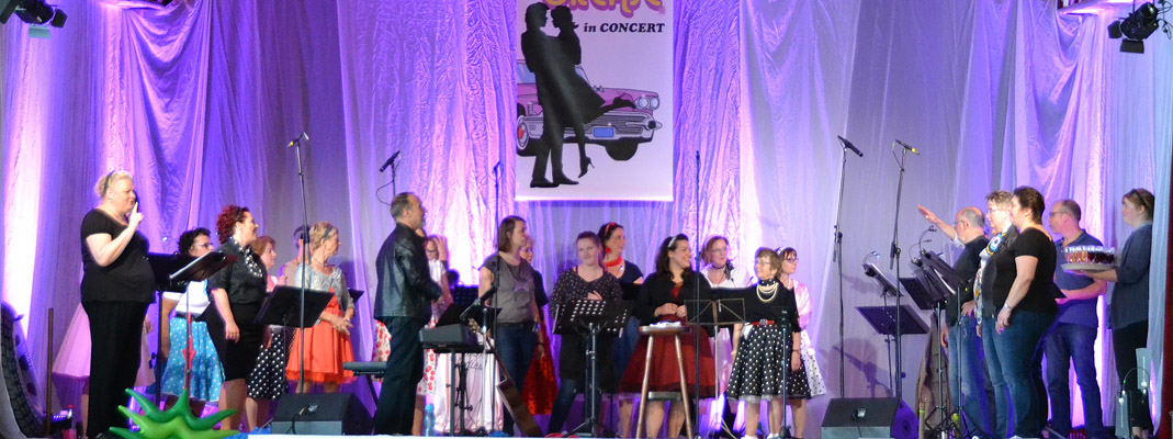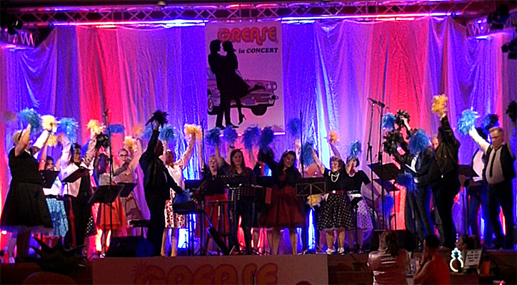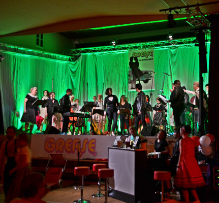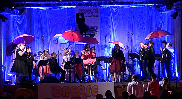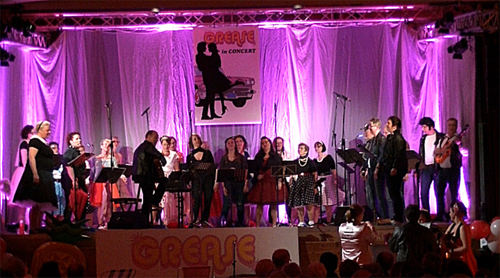 Ein Kultmusical als Konzert? Das geht! Eindrucksvoll bewiesen haben das die Klangwerker der Germania Glattbach am Samstagabend. Mit 300 Besuchern war die Turnhalle des TV Glattbach ausverkauft und bot die perfekt dekorierte Kulisse für „Grease in Concert“. Die 24 Sängerinnen und Sänger des Chores boten in Petticoat und Lederjacke auf der Bühne energiegeladenen Rock´n Roll. Die Solisten aus den eigenen Reihen erzeugten Gänsehautfeeling pur: Lisa Treindl (Sandy), Janine Fazzalari (Rizzo), Christina Löckler (Donna Sue) und Timo Wiesmann (Danny) zeigten, dass sie sich nicht hinter den Originalen verstecken müssen. Auch Chorleiter Martin Hock steuerte als Doody eine kleine Soloparty bei. Jana Kötter erzählte zwischen den Liedern die Geschichte des Musicals. Die Tänzer Andrea und Frank Henz animierten das Publikum, selbst das Tanzbein zu schwingen. So kam es, dass nicht nur beim Finale „You´re The One That I Wan´t” der Platz vor der Bühne gut gefüllt war mit Tanzpaaren, u.a. der Boogie-Club Aschaffenburg in stilechter Kleidung. Stehender Applaus belohnte die Klangwerker.